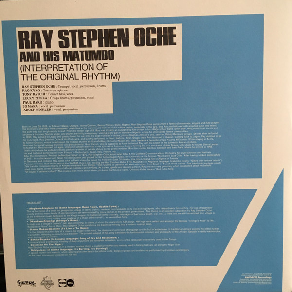 In 1953, Ray arrived in Lagos and quickly found his way into the best musician's circles, joining Stephen Amechi's and, later on, Bobby Benson's groups. Shortly after he found his own band, Ray Stephen Oche & His Orchestra, and quickly performed in Kano, Kaduna, Ilorin, Enugu, Aba, Port Harcourt or Ibadan. Coming back to Lagos, Ray decides to go to Accra (Ghana), where he achieved his musical studies at Ghana Military School of Music and, later, became a favourite of late Kwame N'Krumah. While staying in Accra, Ray met the world famous drummer and percussionist, Guy Warren, who is supposed to have delivered Ray with the secret of the authentic African rhythms.